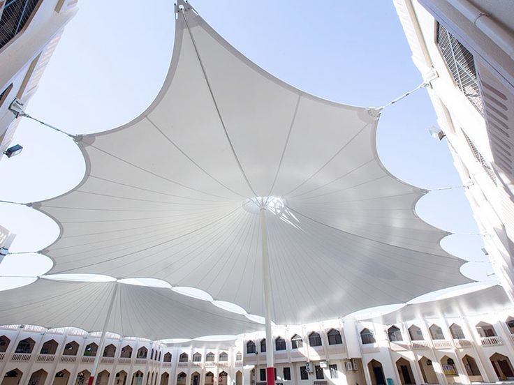 🕌 مظلات المساجد والمعالم: تستخدم لتغطية الساحات الخارجية بتصاميم مستوحاة من العمارة الإسلامية.