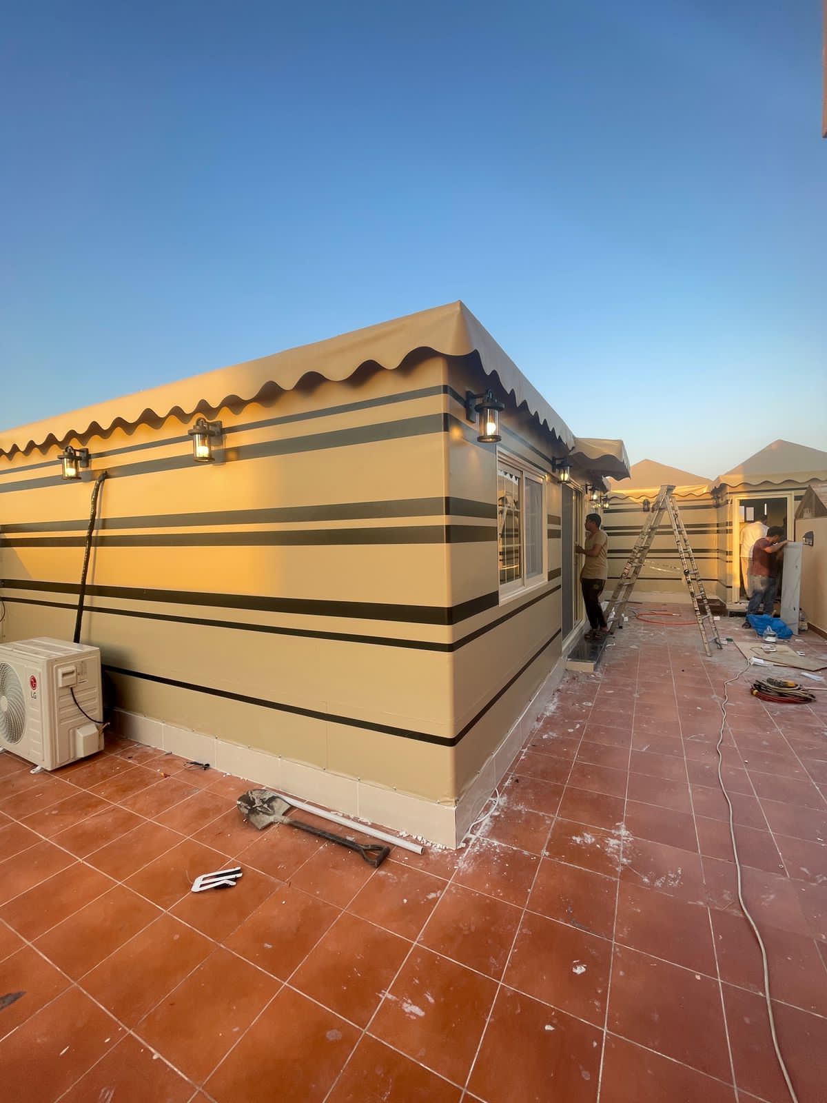 ​هنا تظهر لمسة الفن. يتم تركيب القماش الخاص ببيوت الشعر الذي يتميز بمقاومته للعوامل الجوية. بعد ذلك، يتم إضافة اللمسات الجمالية والزخارف الداخلية التي تضفي على المكان طابعًا عربيًا أصيلًا.