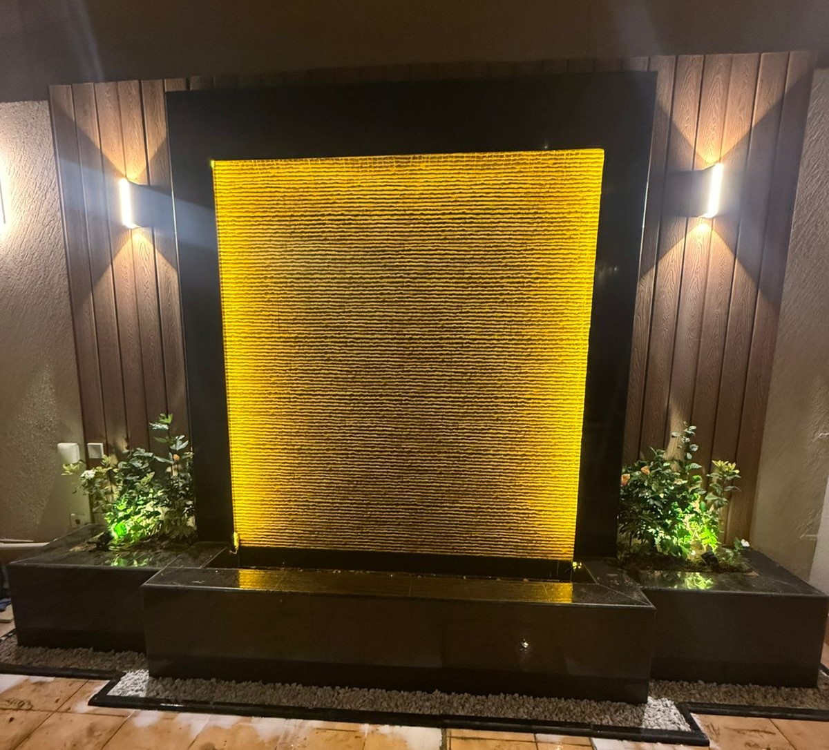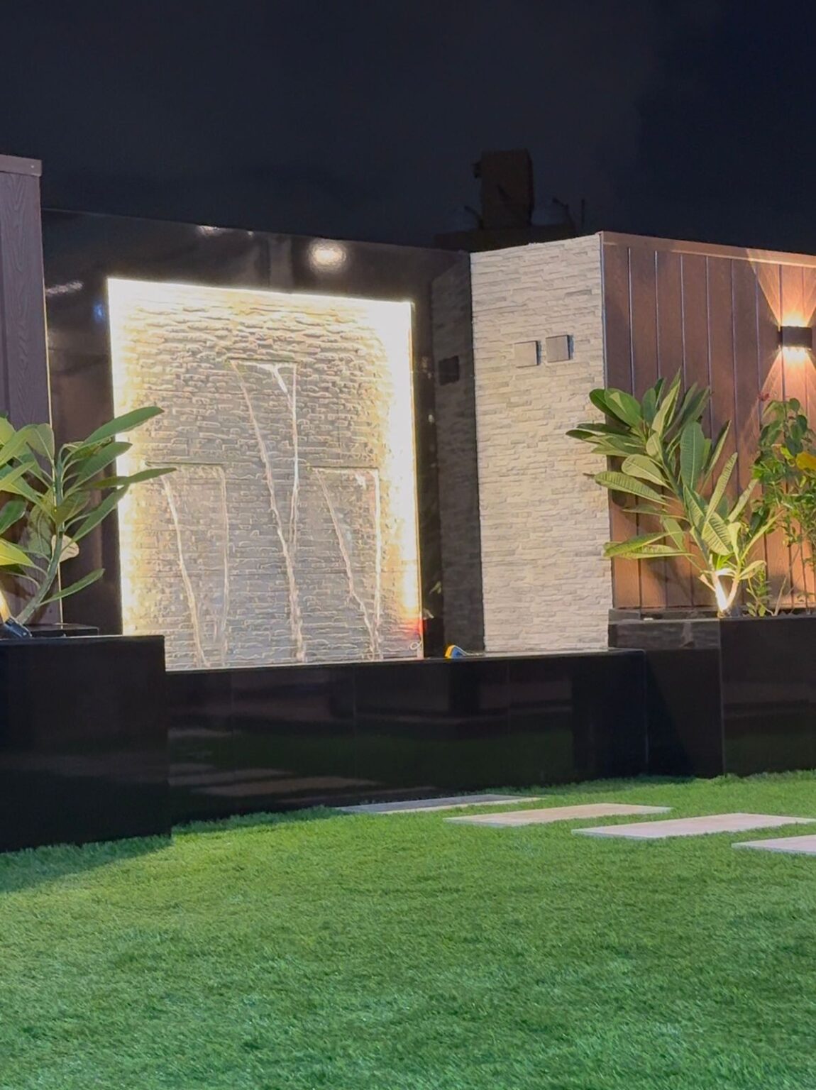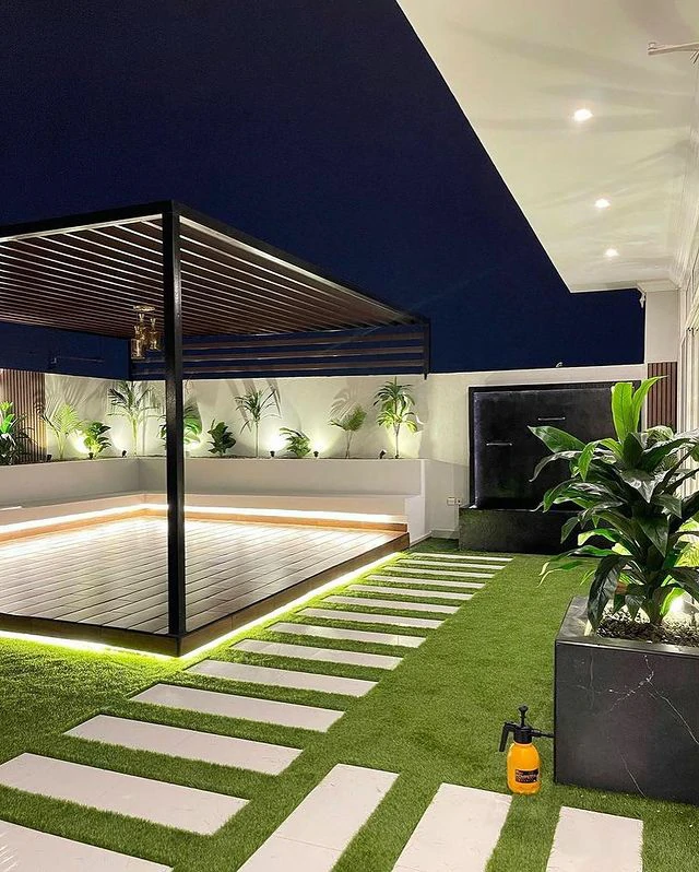 - الإضاءة الساحرة: استخدام الإضاءة الأرضية المخفية لتسليط الضوء على النباتات والشلالات، وإضاءة الشريطيةتحت المقاعد أو حول الجدران لخلق جو هادئ ورومانسي ليلاً.