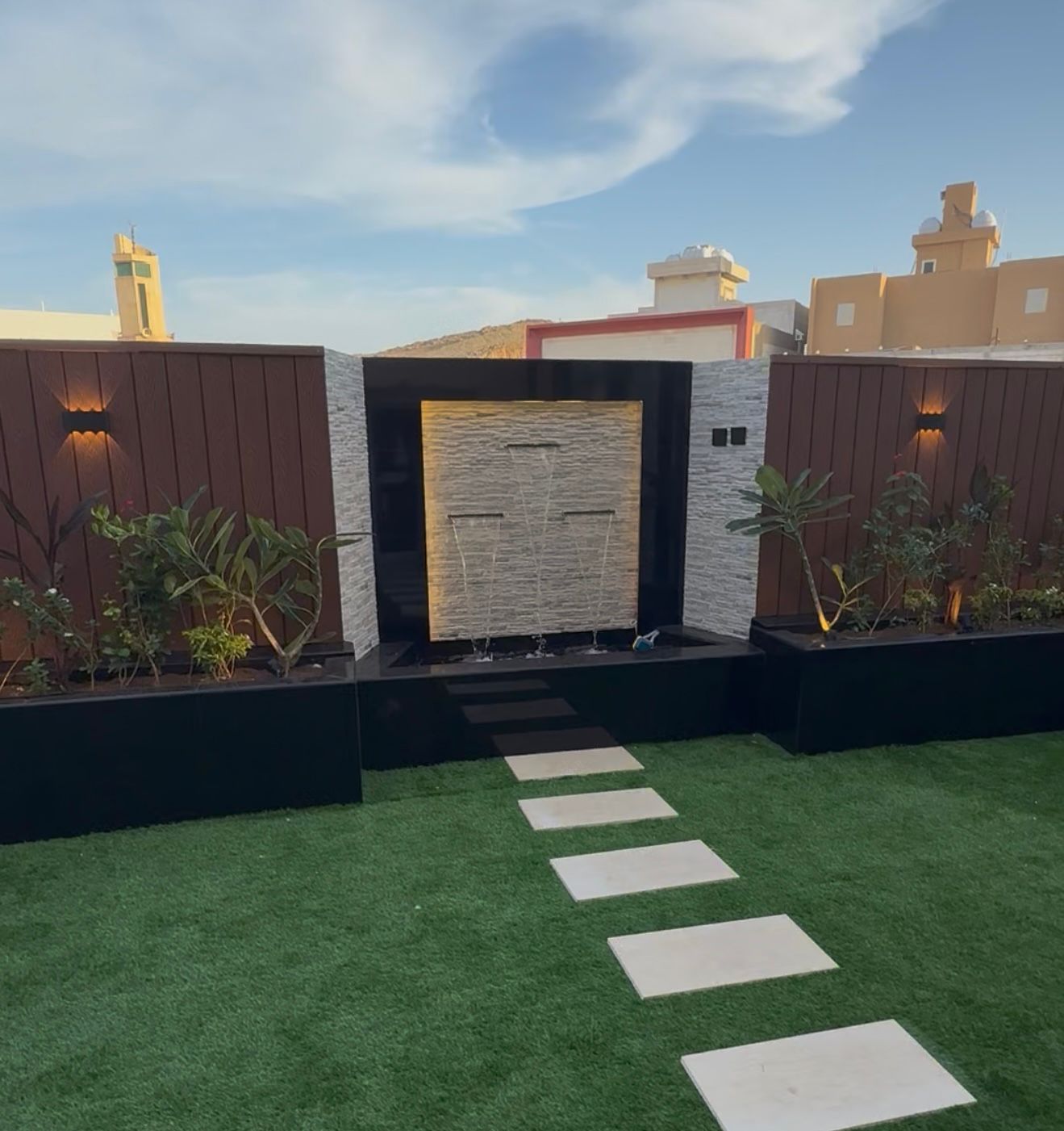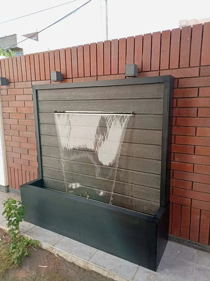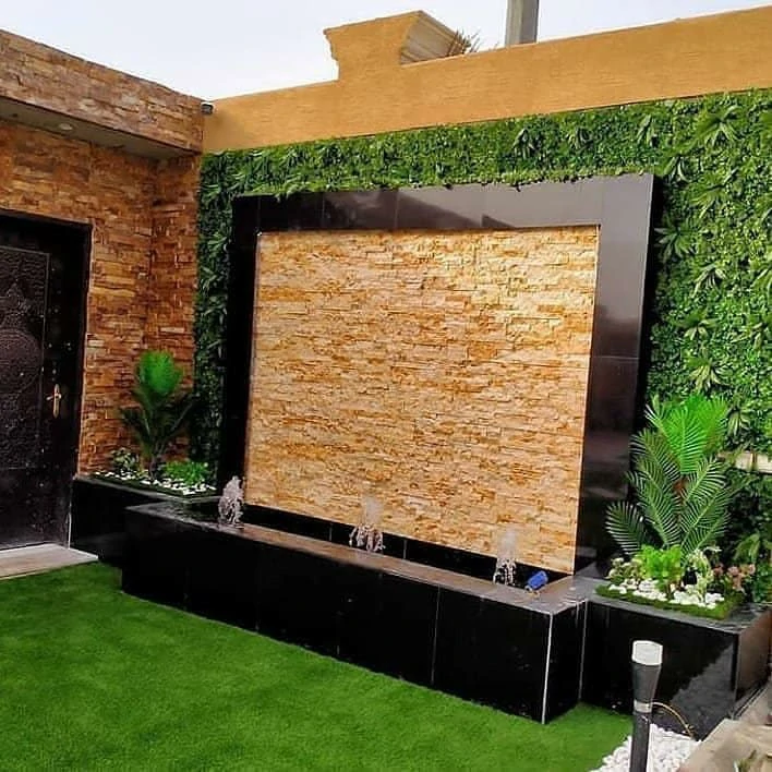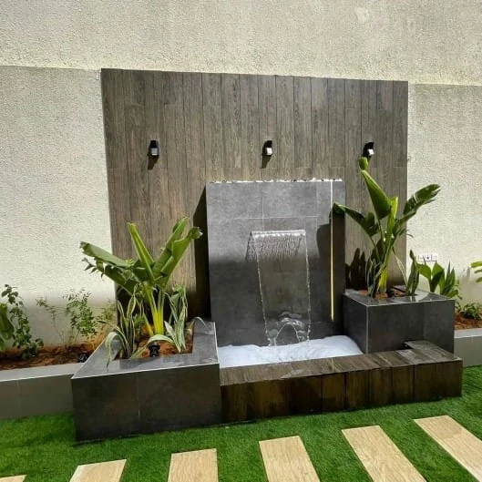 - الفكرة: استغلال الزوايا الميتة في الحوش بتصميم شلالات ثلاثية الأبعاد أو نوافير صغيرة كروية، مما يضيف عمقاً وجمالية دون إعاقة الحركة.