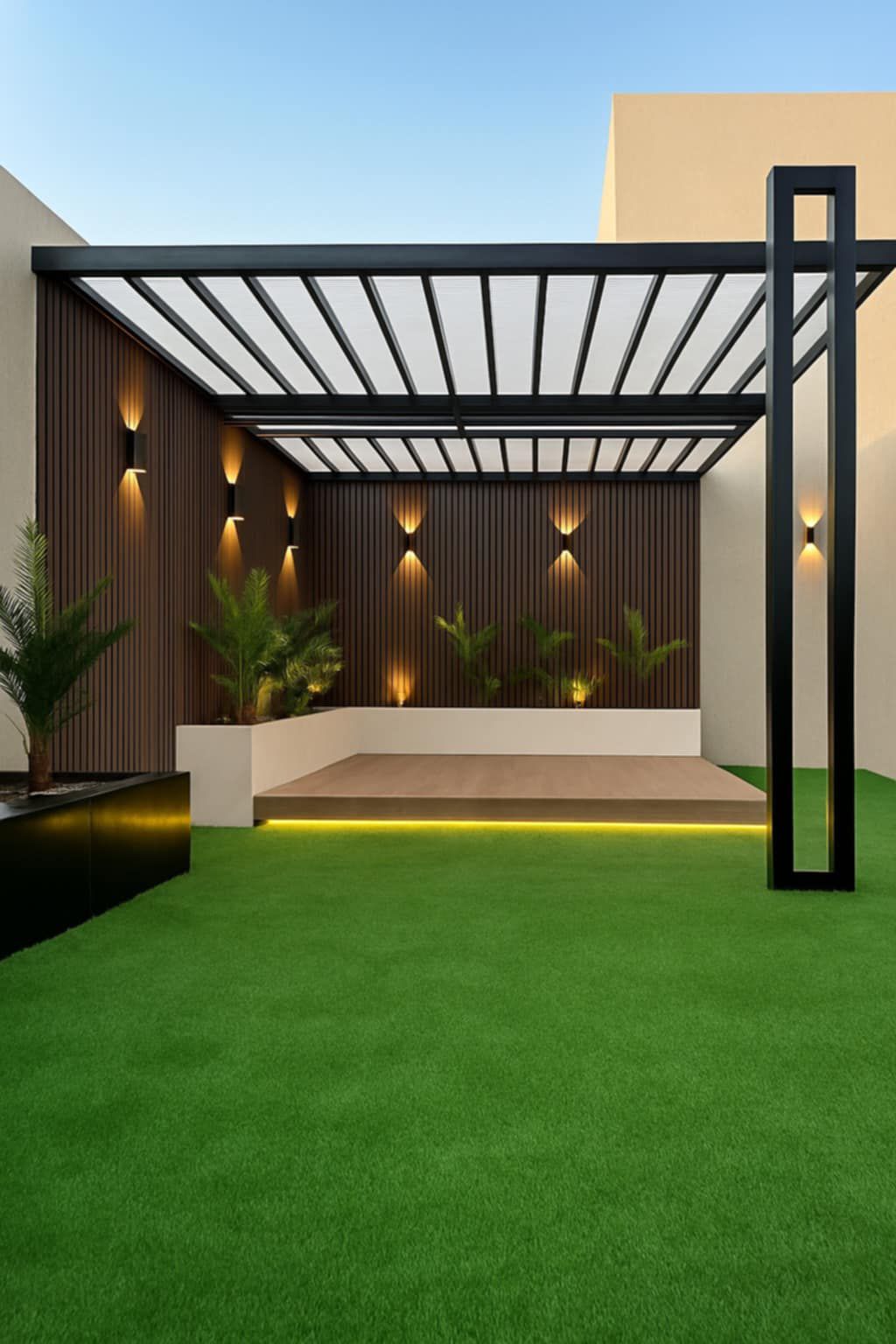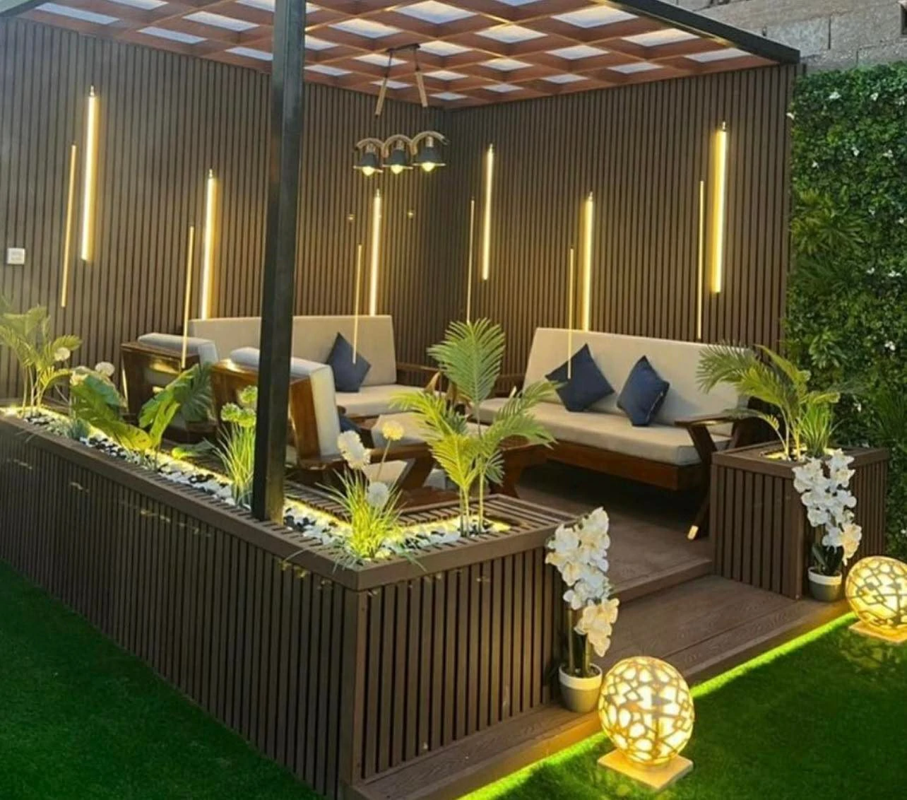 - التنفيذ: استخدام مقاعد وطاولات من مواد تتحمل الحرارة مثل الخوص الصناعي، أو الأثاث المبطن بأقمشة مقاومة لأشعة الشمس، مع إضاءة خافتة مُدمجة في هيكل البرجولا.