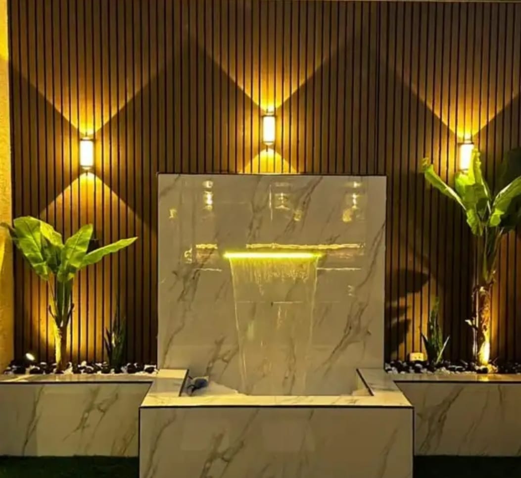 - الفكرة: استغلال الجدران الخارجية لتنفيذ شلالات لا تشغل مساحة أرضية كبيرة.