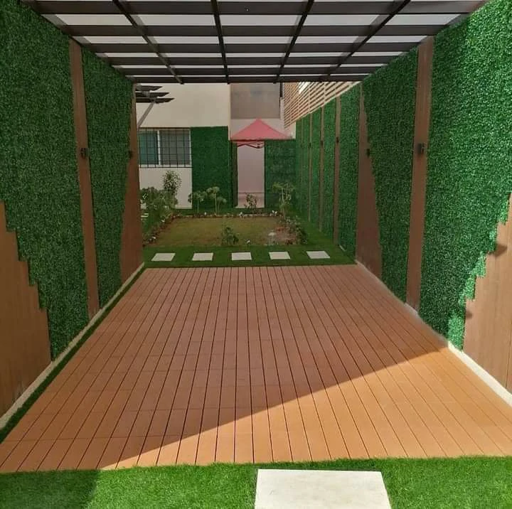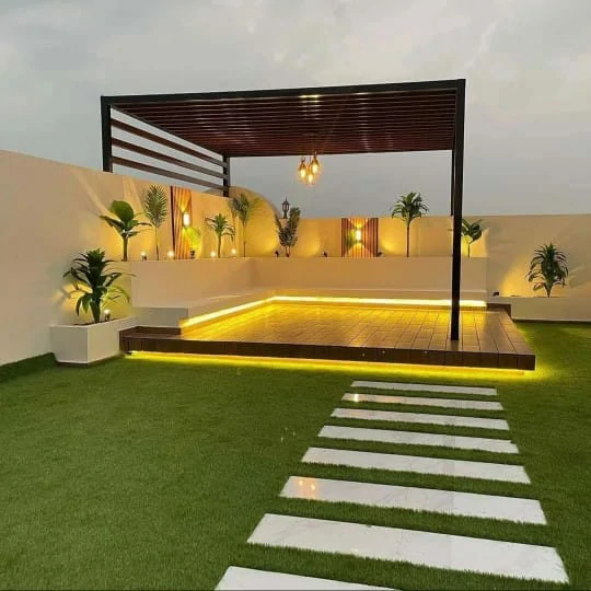 - العشب الجمالي: دمج العشب الصناعي عالي الجودة في مناطق الجلوس، لسهولة صيانته وتحمله لأجواء الرياض.