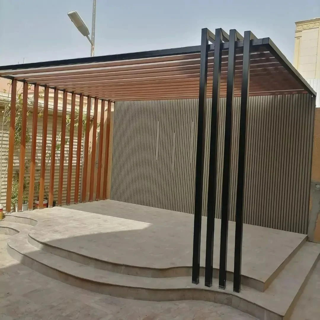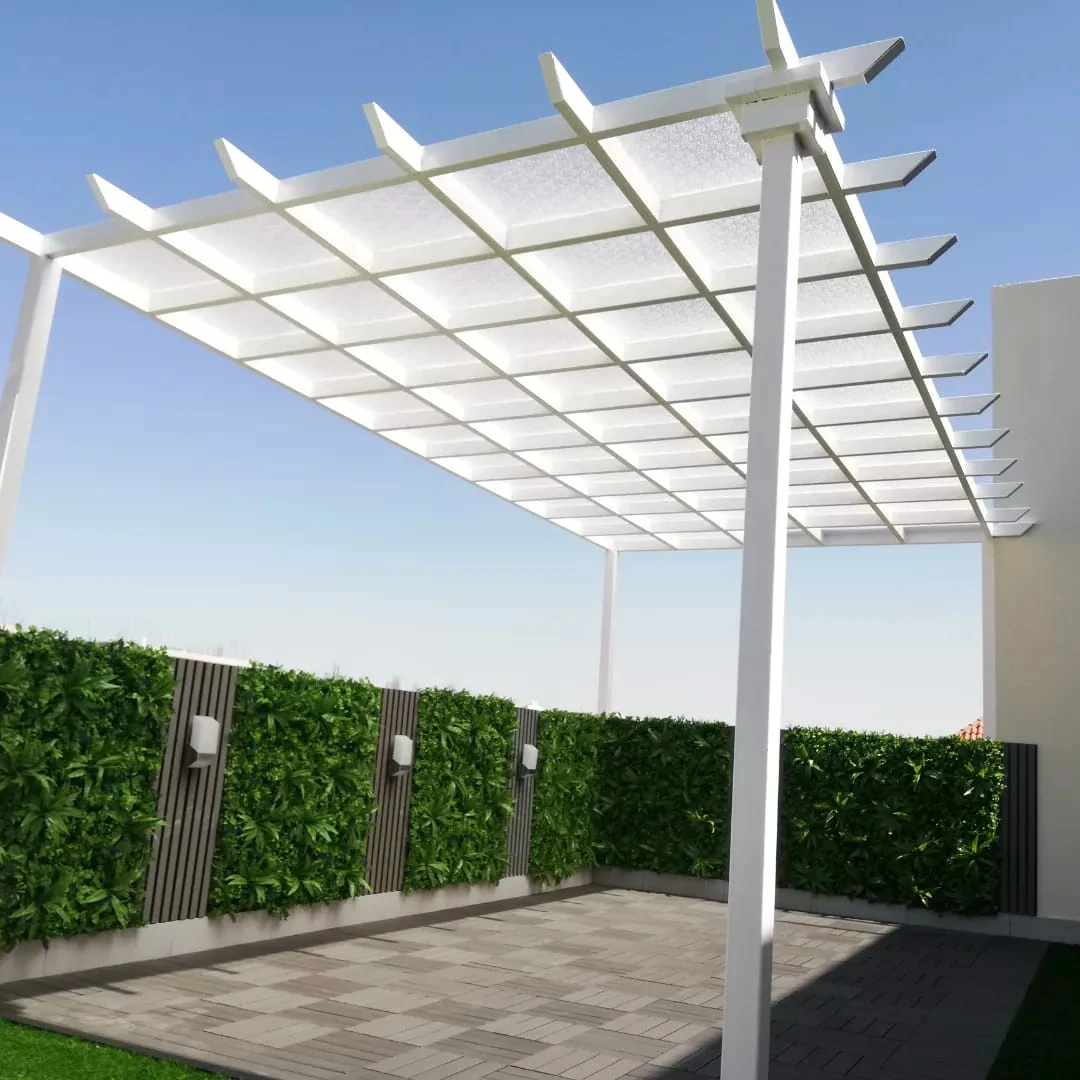 - الفكرة: إنشاء مظلة خشبية (خشب معالج أو بديل الخشب المقاوم) أو معدنية بتصميم عصري لتوفير الظل الضروري.